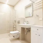 Turto yra privatus vonios kambarys su atskiru tualetu ir dušu, taip pat plaukų džiovintuvais ir rankšluosčiais.
